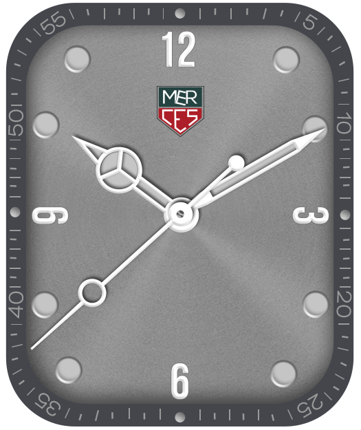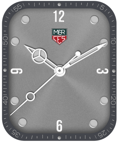 Inspired by Tag Heuer's iconic silver face automatic watch, this MERCĒS face features the Date at the Three o'clock position and a fun parody logo.